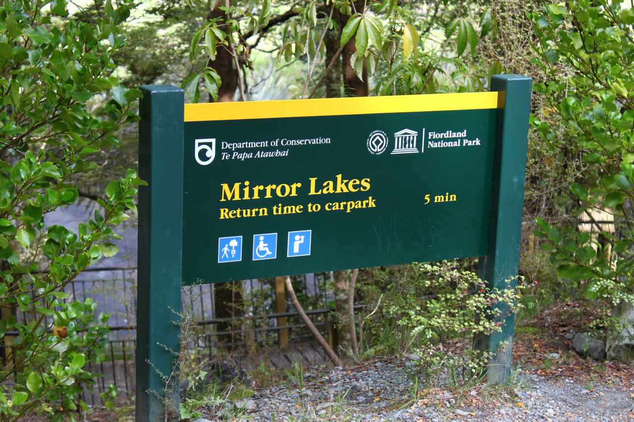 鏡のように山が映るミラー湖 映ったときに正常にみえるよう水上の看板が逆さまに設置