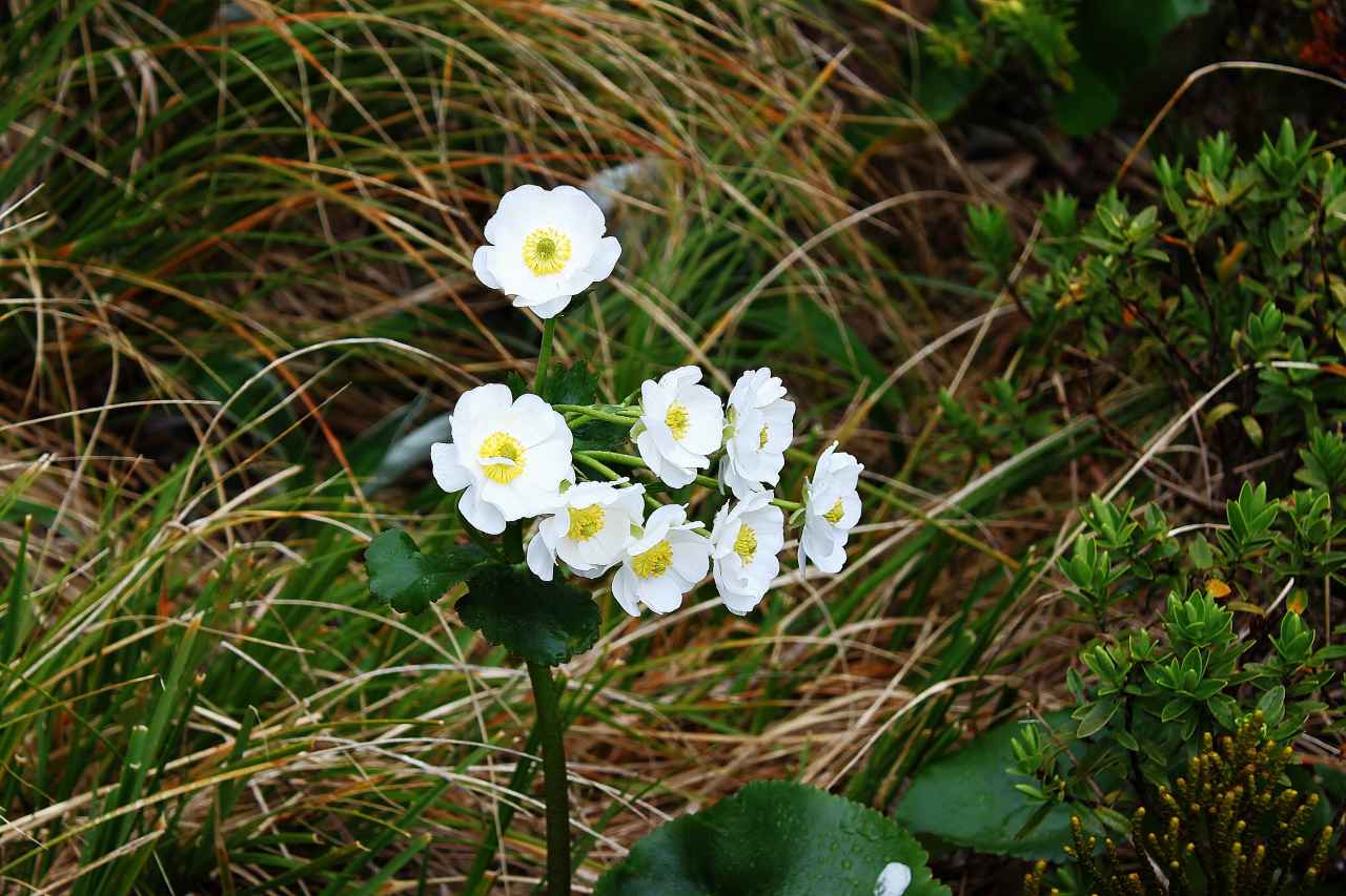 ホーマートンネル手前のダーラン山脈の岩場はお花畑 天候は急速に悪化 小雨で風が強く、寒い