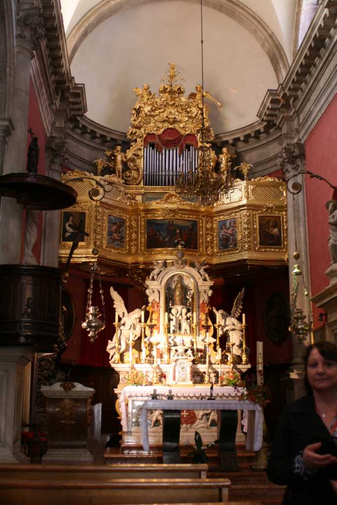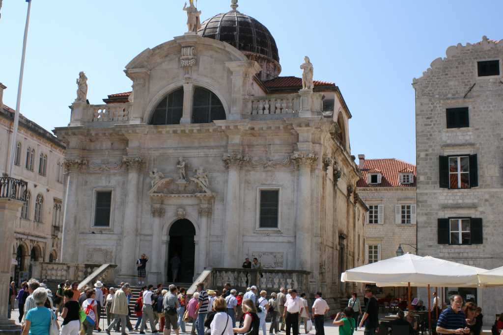 城壁の高さと厚さに驚かされる フランシスコ会修道院 クロアチア最古の薬局などを見てメインストリートのプラツァ通り オノフリオの大噴水(今は噴水無し) ルジャ広場 オルランドの柱 聖ブラホ教会の内部を見て スポンザ宮殿 時計塔 旧総督邸 大聖堂に入った 聖イグナチオ教会前のスペイン広場に似た石段 旧港からフリータイム