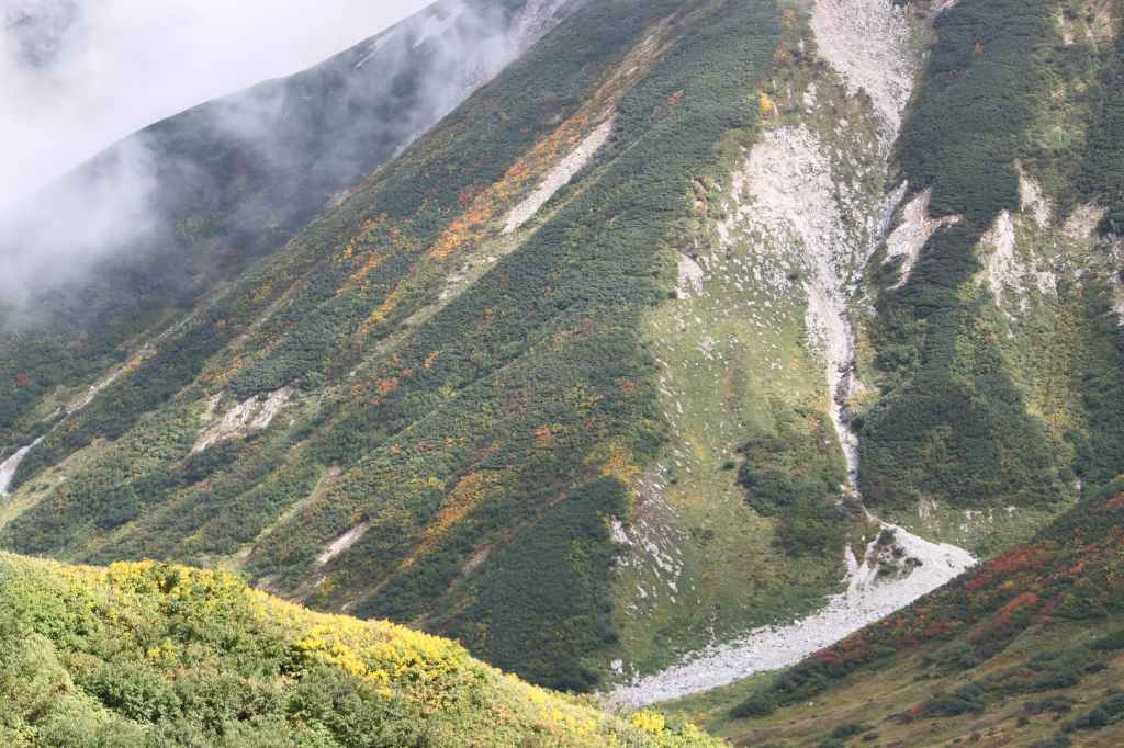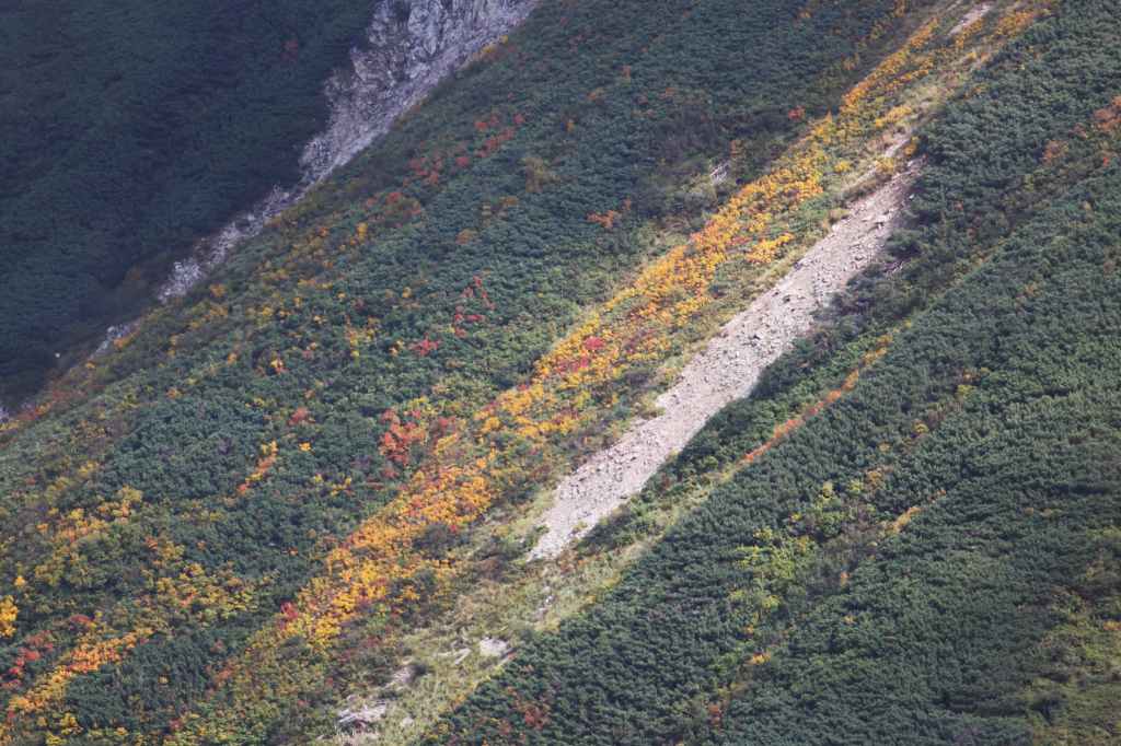 冨士ノ折立から北側の急斜面を降りてきた(写真左)